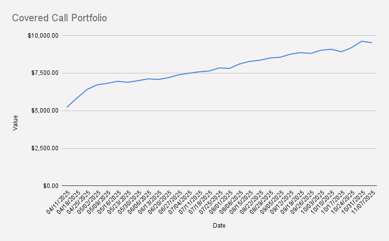 As of November 7, 2025, our covered call stock portfolio has slightly dipped to to $9,514, what is a minor decrease of -1.07% (+$102 if compared to the previous week.