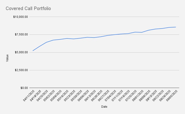 As of September 5, 2025 ,our covered call stock portfolio stood at $8,552, what is another weekly increase of +0.56% (+$47). While Year-to-date, our portfolio is +8.41%. Awesome!