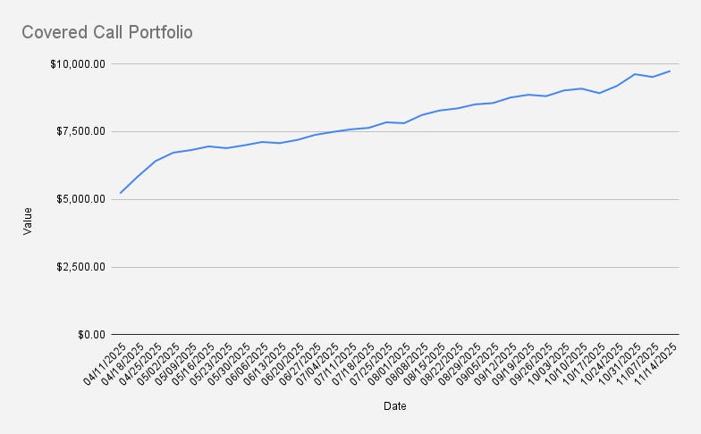 As of November 14, 2025, our covered call stock portfolio has slightly increased to to $9,735, what is a minor increase of +2.32% (+$220 if compared to the previous week. $10,000 feels within reach. With disciplined risk management, we should be able to hit it by year-end — a solid springboard for 2026.