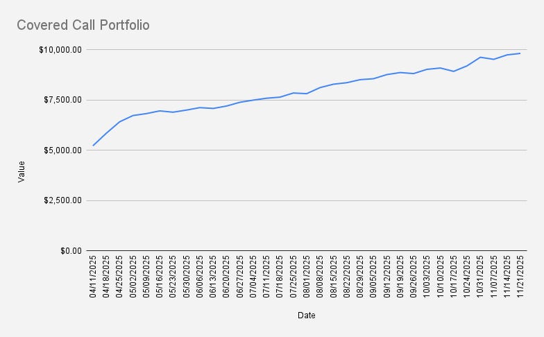 As of November 21, 2025, our covered call stock portfolio has slightly increased to $9,810, what is another minor weekly increase of +0.77% (+$74 if compared to the previous week. $10,000 feels so close. With disciplined risk management, we should be able to hit it by year-end - a solid springboard for 2026.