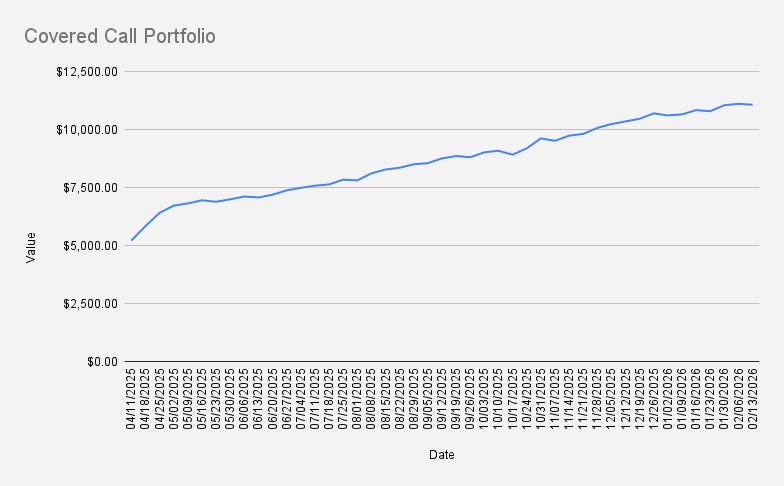 As of February 13, 2026, our covered-call stock portfolio has decreased slightly by -0.33% and closed at $11,069.