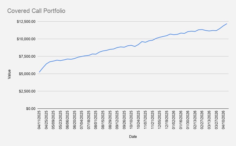 As of April 17, 2026, our options trading driven stock portfolio increased by +2.6%, closing at $12,189, thus for the first time cracking 12K. Awesome.